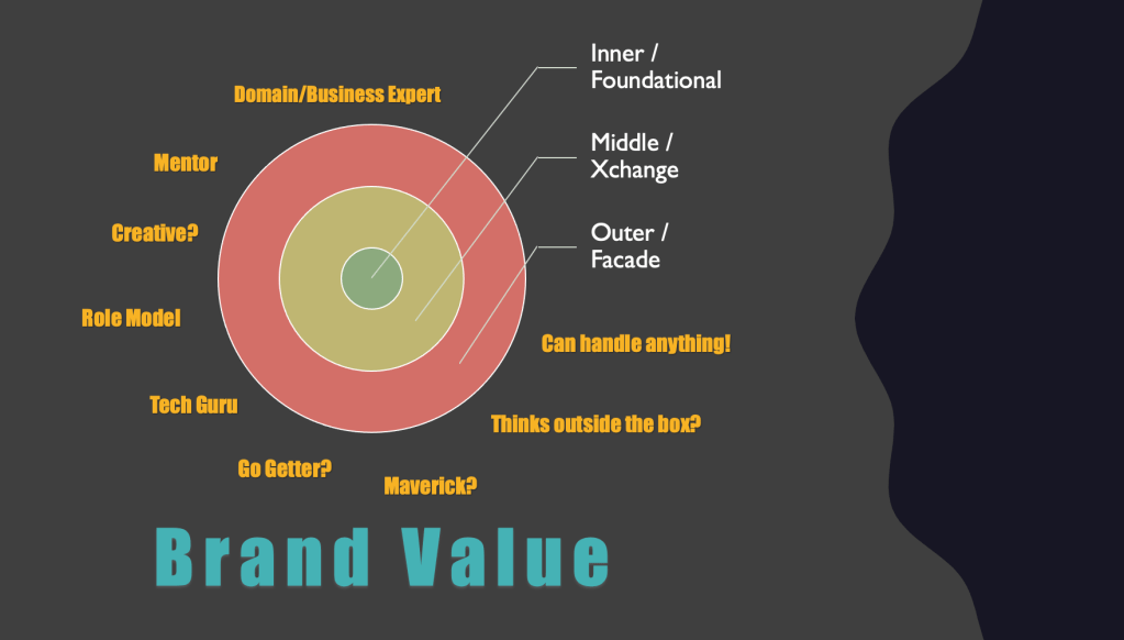 B. Middle (exchange) layer: Mostly influenced by your actions, decisions and by the perception of value add of those directly involved / impacted — friendly, team player, role model, goes beyond, hunger to support are some of the traits / labels to qualify how you fare — in the layer I would call as the “Xchange” layer, where your team’ability stands out