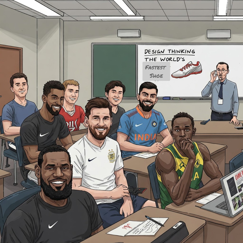 Pic description: The picture shows a classroom like setting with popular sports people LeBron James, Messi, Virat Kohli and Usain Bolt in their sports jerseys and smiling, while the instructor seems confused and the text – “Design Thinking : The world’s fastest shoe” is written on the board. This picture was generated using Google Gemini.